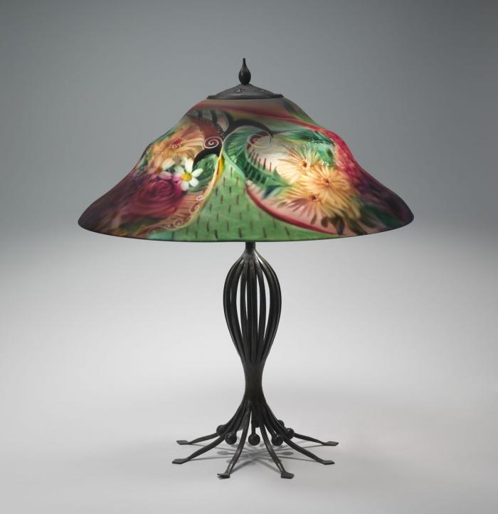 Hand-Forged Iron (Base), Reverse Painted Blown Glass (shade)