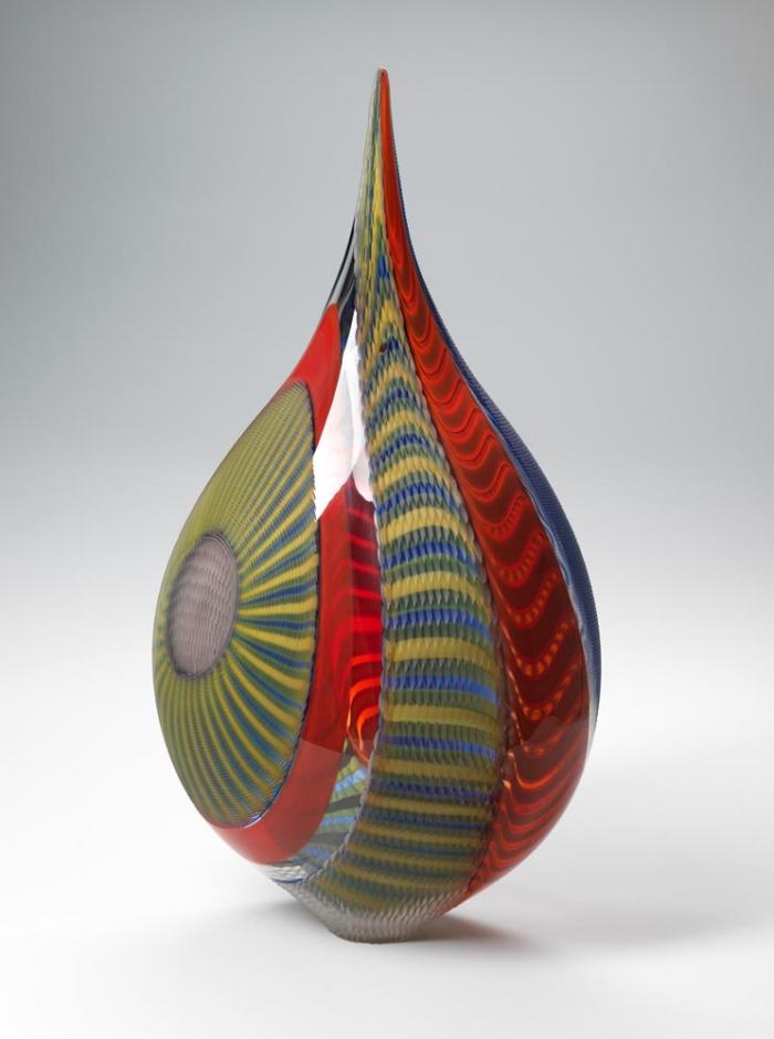 Carved blown glass vessel with glass canes