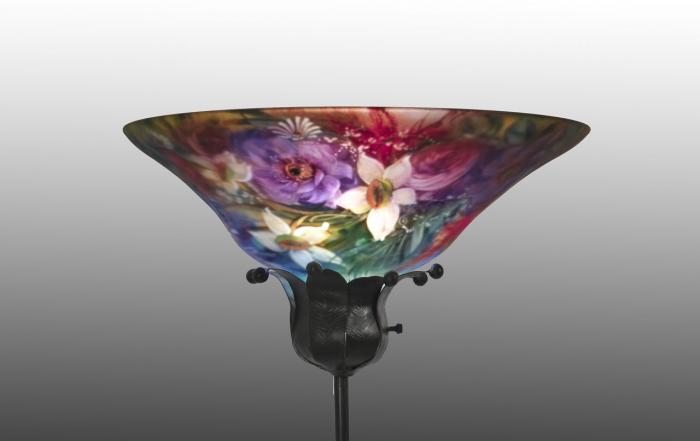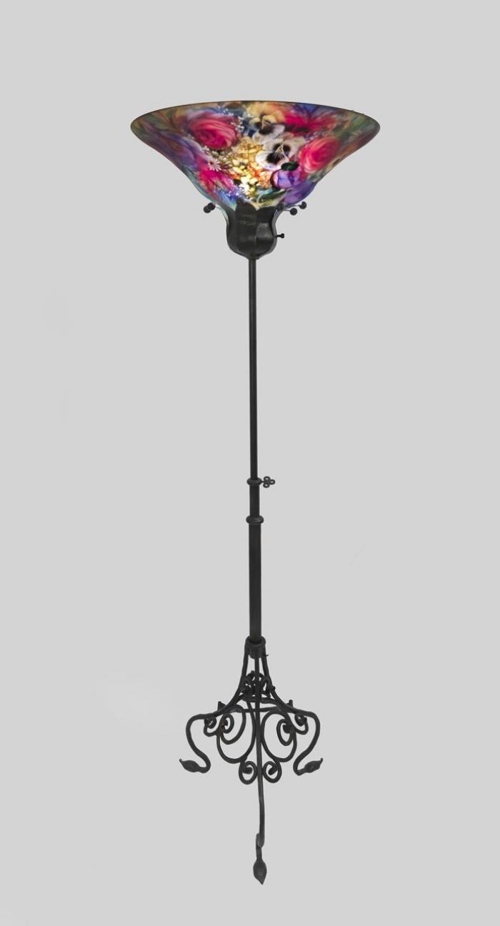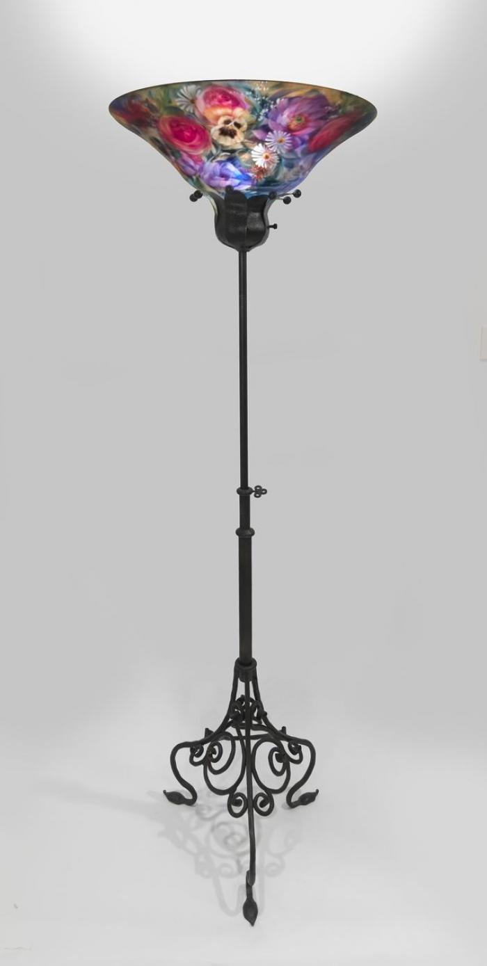Hand-Forged Iron (Base), Reverse Painted Blown Glass (shade)