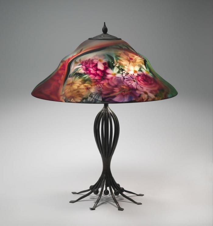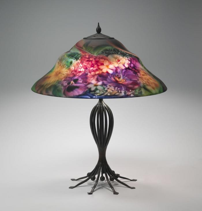 Hand-Forged Iron (Base), Reverse Painted Blown Glass (shade)