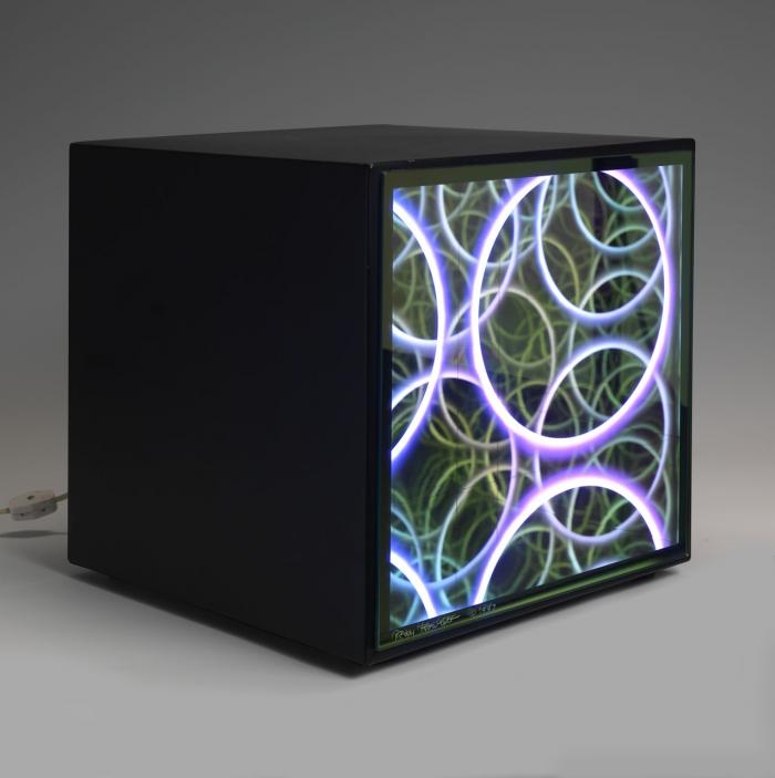 Graphic images of light that appear to be floating inside the sculpture. The images reflect inward creating compositions in multiple layers throughout the open transparent space. Looking into the sculpture is like looking through a window into the 4th dimension